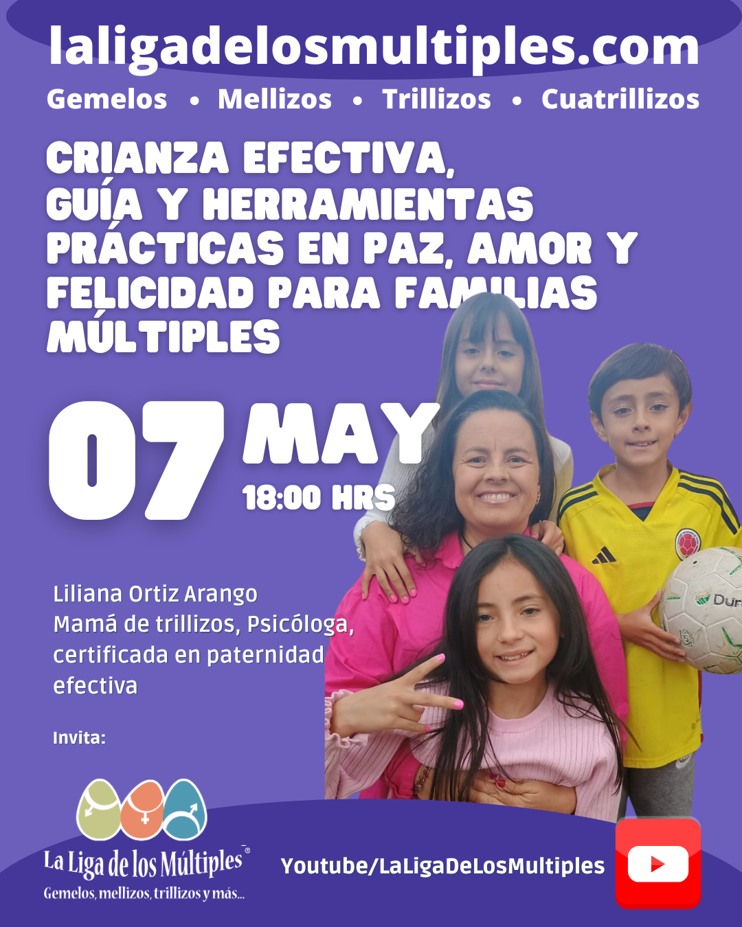 Este miércoles a las 6:00 p.m. nos encontramos en un nuevo live de @ligademultiples con Liliana Ortiz Arango, psicóloga y mamá de trillizos, quien nos compartirá herramientas prácticas y amorosas para acompañar la crianza de tus múltiples sin perder la calma… ¡ni el corazón! 💛